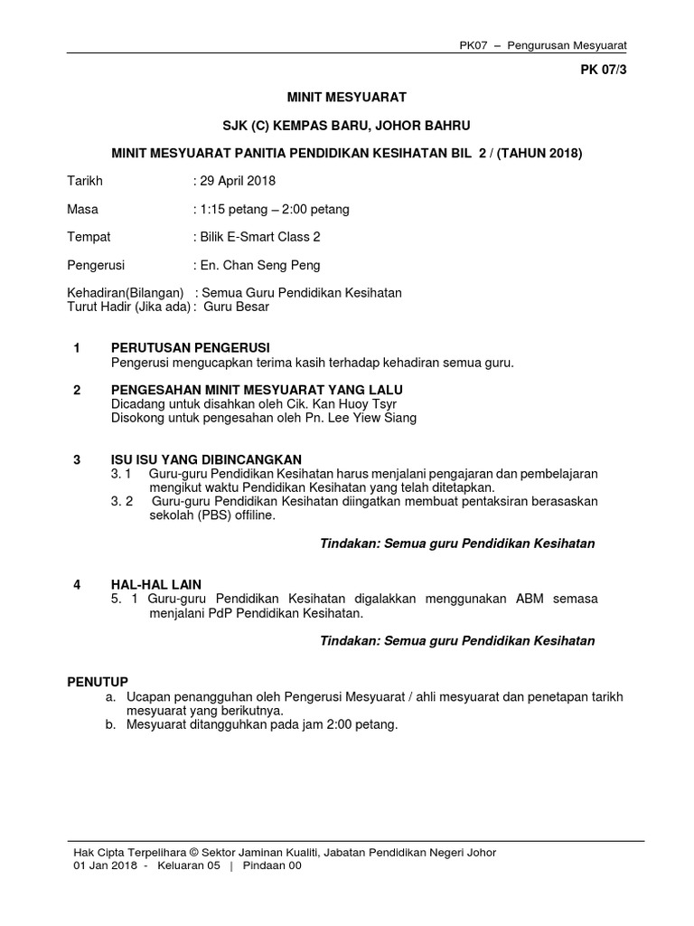 Borang pk 07 3 contoh format minit mesyuarat. 31 ucapan pengerusi 32 membentang dan mengesahkan minit mesyuarat lalu. Maklumat mesyuarat Semua maklumat mesyuarat perlu dinayatakan merangkumi tarikh hari masa dan tempat mesyuarat.