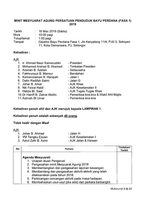 830 malam - 1030 malam Tempat. Pembentangan minit mesyuarat yang lalu setiausaha 4. Youll find fields for an attendee list agenda topics and an action item section that lists task owner and deadline.