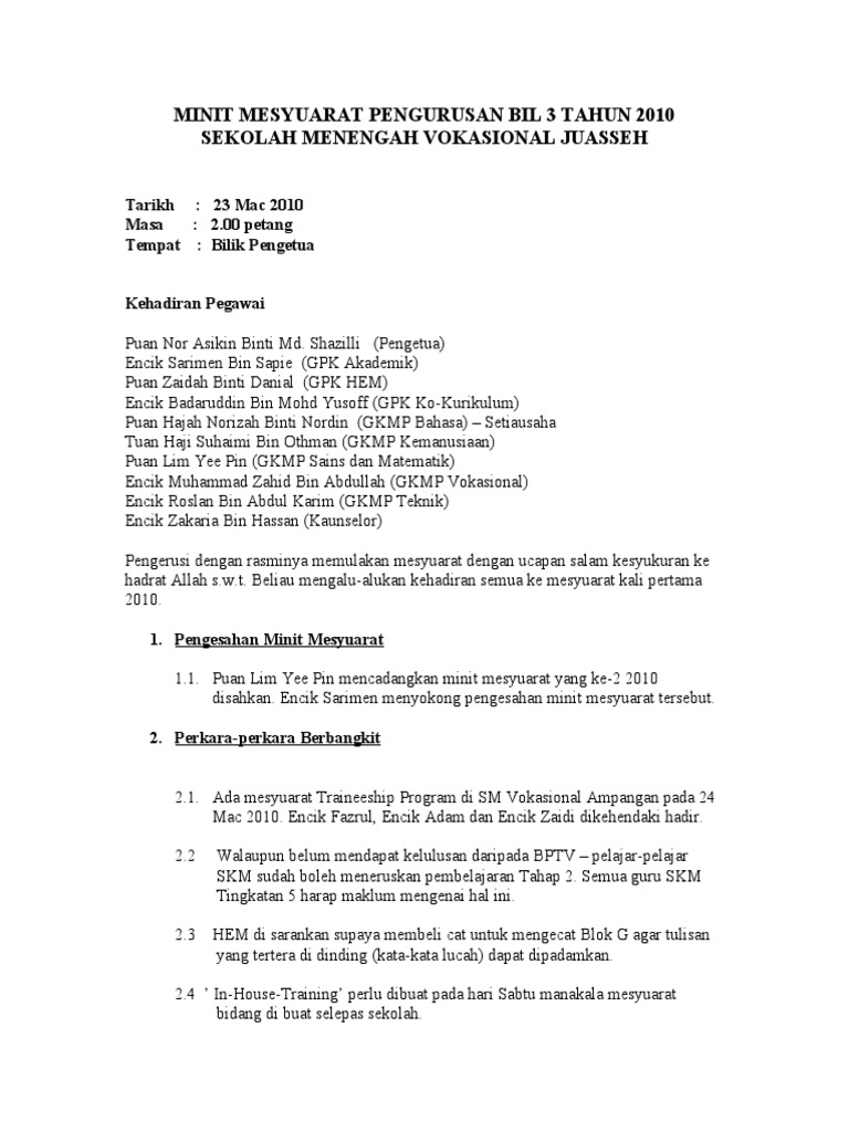 Begitulah seterusnya jika ada banyak nombor yang akan digunakan. Berikut disertakan cara buat dan contoh minit mesyuarat yang berkualiti lengkap dan mudah beserta maklumat format dan contoh. Dibangkitkan semasa mesyuarat membincangkan perkaraperkara berbangkit atau semasa membincangkan kertaskertas kerja atau di akhir mesyuarat.