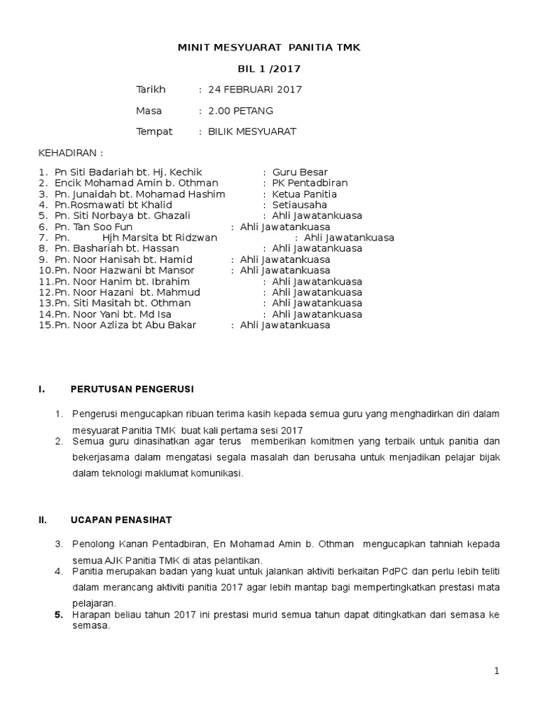 Minit mesyuarat Bil12014 diterima sebulat suara daripada semua ahli tanpa sebarang pindaan. Antara perkara yang perlu ada dalam minit mesyuarat adalah Tajuk Minit Mesyuarat BilTahun Tarikh Masa Tempat Kehadiran senarai nama mengikut kedudukan jawatan Catatan Mesyuarat Urusetia catatkan nama bahagian unit yang bertanggungjawab menguruskan mesyuarat dan Tarikh catatkan tarikh minit mesyuarat pada hari berkenaan.